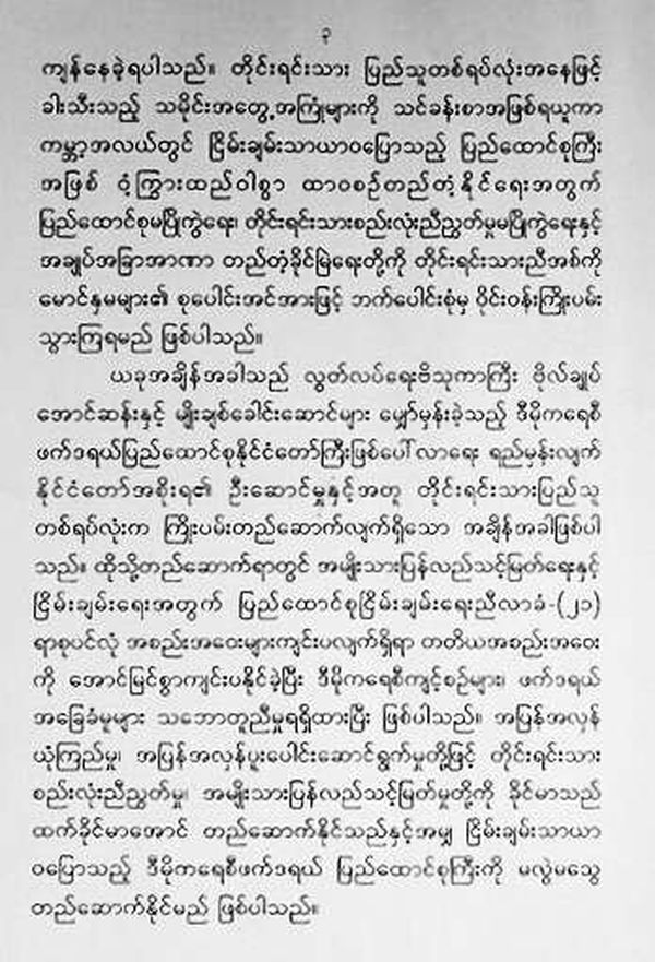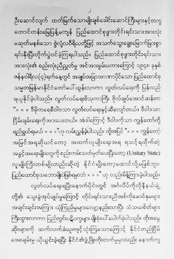 自古以来,缅甸就是一个独立自主的主权国家,然而,因为英国殖民者在1824年、1852年、1885年发动的三次侵略战争,使我国于1885年11月沦为殖民地,丧失了国家主权。为了重新获得独立、自由,有胆有识的民族先烈、国父、国家独立缔造者――昂山将军带领崇高的爱国主义者,平原和山区的各民族同胞与侵略者英勇奋战,经联邦内居住的各族人民的团结和不懈努力,缅甸在1948年1月4日恢复了国家主权,建立了缅甸联邦共和国。国家独立缔造者――昂山将军曾讲“只有民主主义与独立相符合,此主义有利于和平,所以我们要以此主义为目标”。此外他还讲过“依照我们所看到的,根据上述民族问题,为了让各民族获得应有的权利制定相关规定,再建立一个民族独大国家是不可取的,只能是联邦主义”。