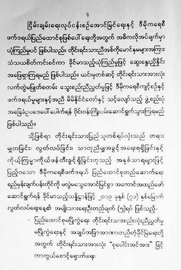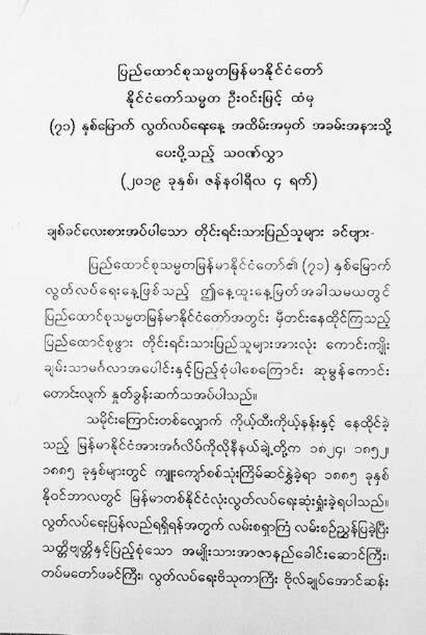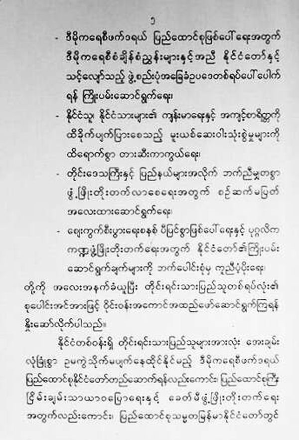 为了全国各民族同胞都能和平、安全生活在民主联邦共和国内,大联邦的和平稳定与发展的新时代中,缅甸联邦共和国内无论省或邦都能享有民主权利、都能实现自己的愿望。让我们以纯洁的心志、真诚的态度,全身心地投入到建设国家的美好工作中。
