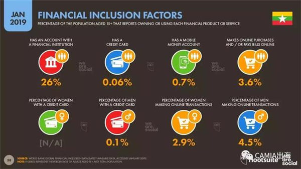 26%的15岁以上缅甸人拥有金融机构账户。信用卡持有率仅为0.06%。手机钱包账户持有率为0.7%。与此同时,仅有3.6%缅甸人在线进行商品交易/支付账单。