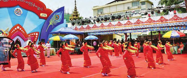 上午9时,各国使节及家属们抵达仰光市政厅大厦的中央彩棚。仰光省议会副议长U Lin Naing Myint与夫人,仰光市市长U Maung Maung Soe及泼水节舞蹈队队员们以蒲桃枝(Thapyay Khet)向来宾们洒水表示欢迎。前来仰光市中央彩棚参与泼水节活动的外国使节及家属们,在观赏了民族歌舞团及歌手们的歌舞及表演之后,大家愉快地泼水互相祝福。