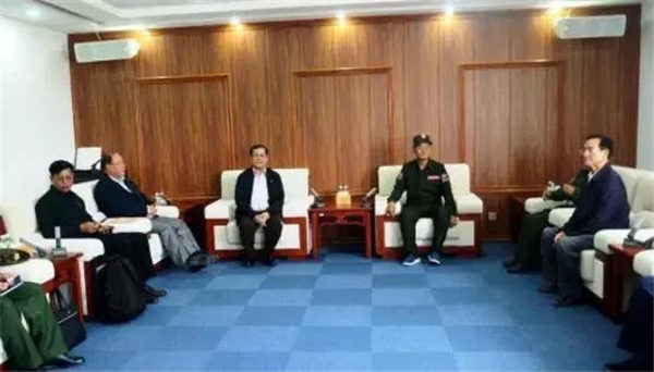16日早晨6点半,政府代表团从仰光国际机场出发,乘机前往景栋机场,再从景栋机场乘直升机前往佤邦第二特区,上午9点40分左右抵达了邦康,佤邦团结党副主席、副总秘书等官员对他们进行了迎接。之后,佤联军总司令鲍有祥及其带领团队,在接待大厅会见了政府代表团,热烈欢迎他们的到来。