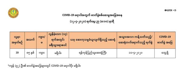 新发现的第39位确诊者(Case-39)是来自仰光省班贝坦镇区的85岁男性公民,其于4月9日开始出现发烧、咳嗽等病症,4月11日到仰光大医院求医,作为观察病人取得其化验样本后发现了新冠病毒。该病患在过去14天内没有国外旅行经历,本人则还患有糖尿病及冠心病等病症。该病患在到达医院时已显得十分疲乏,血液内氧含量也下降,虽给予了需要的护理治疗,终究回天乏术,于4月12日上午6时逝世。逝世的原因是严重的肺炎、糖尿病、高血压及冠心病等综合迸发的结果。