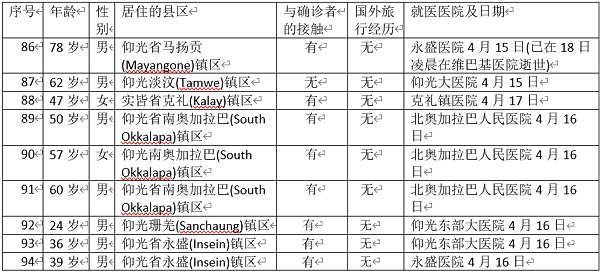 又,在4月17日发现的来自永盛(Insein)镇人民医院的确诊者(按,就是第86名确诊者),是78岁的男性公民,其本来就患有糖尿病及高血压,在4月13日出现新冠疫情病症,4月15日在永盛人民医院接受观察治疗。在其成为新冠病毒确诊者后,于4月17日移送至维巴基医院继续接受治疗。在该医院的特殊病房中接受医疗时于4月18日凌晨2时55分逝世。逝世原因为严重肺炎导致呼吸管道遭破坏,以及高血压、糖尿病等综合病症造成的。
