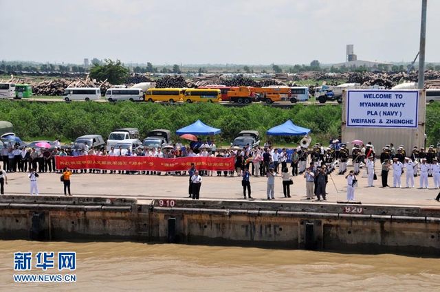 当地时间上午11点,两舰依次靠泊仰光迪洛瓦港。中国驻缅甸大使馆代办陈辰、武官熊韶炜等使馆人员,中资机构、华侨华人代表,及缅甸海军代表等300多人到码头迎接。缅方为中国客人举行了热烈的欢迎仪式。