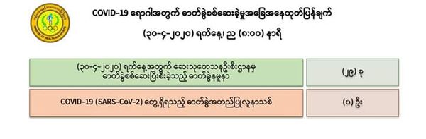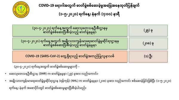 5月1日上午7时,卫生暨体育部再发出公告,介绍仰光国家卫生化验室(NHL)对208名人员的化验样本进行化验的情况。这时发现有一样本中含有新冠病毒,其余207人的样本中没有此病毒。