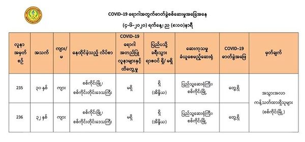 缅甸卫生暨体育部于6月4日晚上8时及6月5日上午8时分别发出公告,介绍缅甸国内这新冠病毒疫情发展的最新情况。
