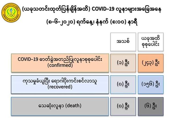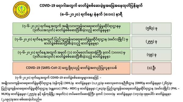 6月7日下午,仰光国家卫生化验室(NHL)对第一批的560名人员的化验样本进行化验检查,医药科研所(DMR)对 265名人员的化验样本进行化验检查, 曼德勒人民卫生化验室对283名人员的化验样本进行化验检查, 第一军医1000床位医院对第一批92名人员的化验样本进行化验检查,共1200人的化验样本中,发现2人的样本中含有新冠病毒。