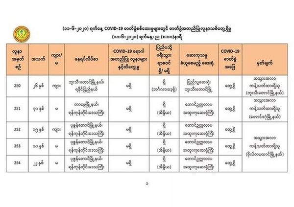 6月11日下午,仰光国家卫生化验室(NHL)对第一批的652名人员的化验样本进行化验检查,医药科研所(DMR)对 193名人员的化验样本进行化验检查,曼德勒人民卫生化验室(PHL-MDY)对358名人员的化验样本进行化验检查,毛淡棉人民卫生化验室(PHL-MLM)对94名人员的化验样本进行化验检查,共1297人的化验样本中,发现有11人的样本中含有新冠病毒。