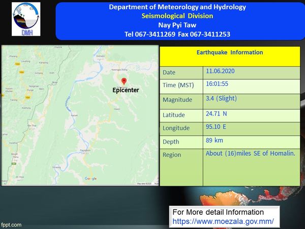 据缅甸水文与地震局消息,当地时间6月11日16时01分55秒,在缅甸实皆省霍马林市(Homalin)东南方向25.7公里处发生3.4级地震;震中位置为北纬24.71度,东经95.10度;震源深度89公里。