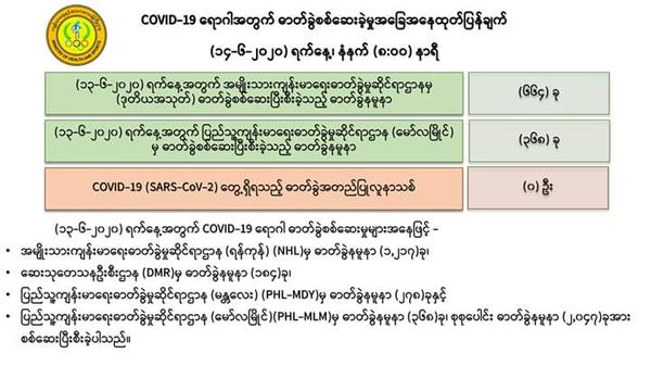 6月13日下午,仰光国家卫生化验室(NHL)对第一批的553名人员的化验样本进行化验检查,医药科研所(DMR)对 184名人员的化验样本进行化验检查,曼德勒人民卫生化验室(PHL-MDY)对278名人员的化验样本进行化验检查,共1015人的化验样本中,没有发现任何人的样本中含有新冠病毒。