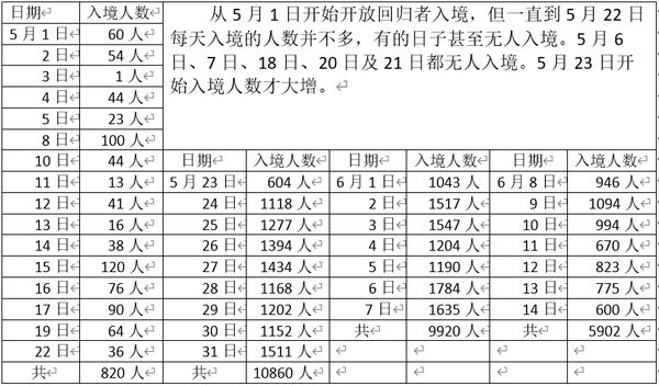 从5月1日至5月22日入境人数共820人,之后入境人数大增,1天的人数就超过这人数了。从5月23日至月底入境人数共有10860人。6月份第一周入境人数9920人,第二周入境人数5902人,总计至6月14日,由妙瓦底口岸入境人数达到27502人。现在每天入境人数不似高峰时期每天到达上千人,但也是还有几百人,而且短期内这人数还不会减少。