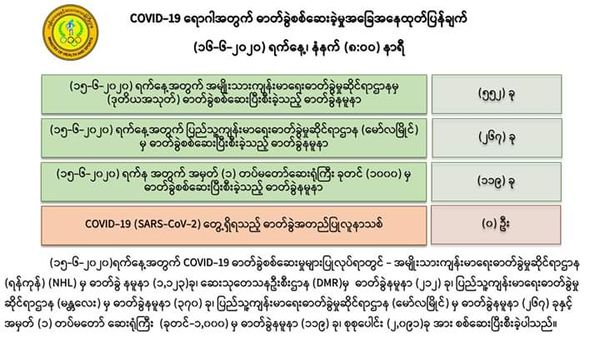 6月16日上午8时,卫生暨体育部再次发出公告,仰光国家卫生化验室对第二批552名人员的化验样本进行化验检查,毛淡棉人民卫生化验室对267名人员的化验样本进行化验检查,仰光第一军医1000床位医院对119名人员的化验样本进行化验检查,共938人的化验样本中,没有发现任何人的样本中含有新冠病毒。
