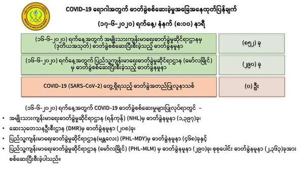6月17日上午8时,卫生暨体育部再次发出公告,仰光国家卫生化验室对第二批852名人员的化验样本进行化验检查,毛淡棉人民卫生化验室对290名人员的化验样本进行化验检查,共1142人的化验样本中,没有发现任何人的样本中含有新冠病毒。
