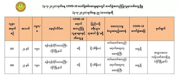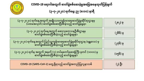 7月3日,仰光国家卫生化验室(NHL)对第一批的282名人员的化验样本进行化验检查,医药科研所(DMR)对 266名人员的化验样本进行化验检查,曼德勒人民卫生化验室(PHL, Mandalay)对276名人员的化验样本进行化验检查,仰光第一军医1000床位医院对156名人员的化验样本进行化验检查,共980人的化验样本中,发现2人的样本中含有新冠病毒。