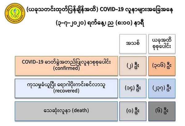 缅甸卫生暨体育部于7月3日晚上8时及7月4日上午8时分别发出公告,介绍缅甸国内这新冠病毒疫情发展的最新情况。