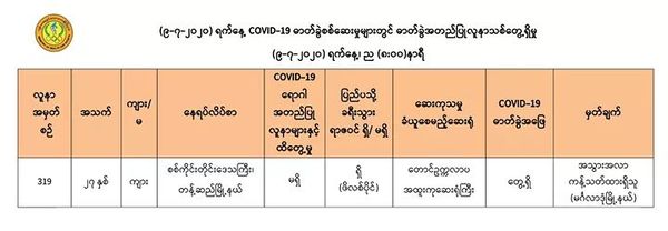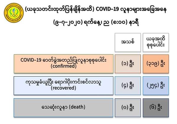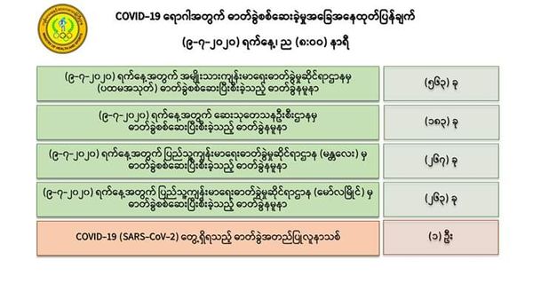 7月9日,仰光国家卫生化验室(NHL)对第一批的563名人员的化验样本进行化验检查,医药科研所(DMR)对 183名人员的化验样本进行化验检查,曼德勒人民卫生化验室(PHL, Mandalay)对267名人员的化验样本进行化验检查,毛淡棉人民卫生化验室(PHL, Mawlamyine)对263名人员的化验样本进行化验检查,共1276人的化验样本中,发现有1人的样本中含有新冠病毒。