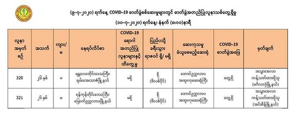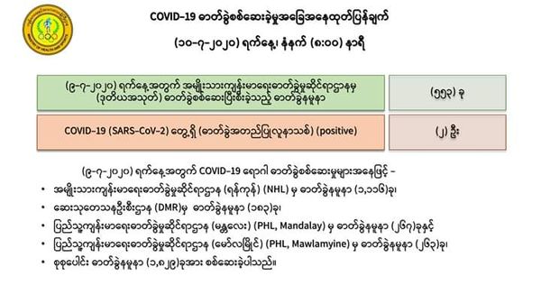 7月10日上午8时,卫生暨体育部再次发出公告,仰光国家卫生化验室对第二批553名人员的化验样本进行化验检查,又发现有2人的样本中含有新冠病毒。