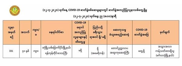 至此,缅甸国内新冠病毒确诊人数增加到331人。