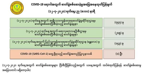 7月12日仰光国家卫生化验室检验的化验样本中,包括准备出席第17次人民议院及民族议院会议的议员代表452人及辅助工作人员10人,共462人的样本,都没有发现新冠病毒。