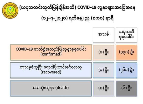 缅甸卫生暨体育部于7月12日晚上8时发出公告,介绍缅甸国内这新冠病毒疫情发展的最新情况。