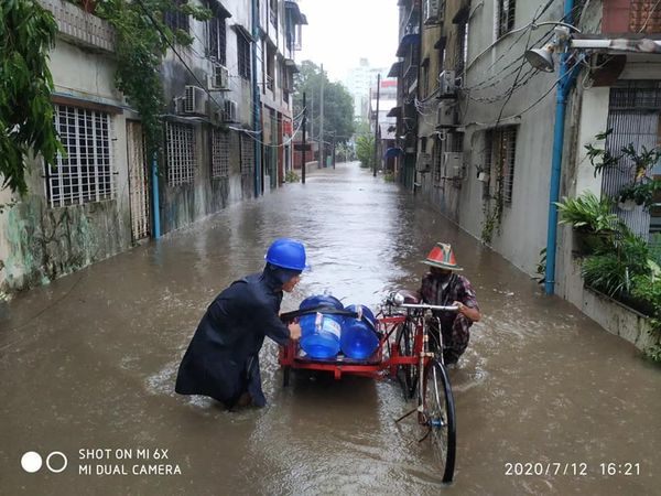 7月12日中午开始下暴雨,因正逢江水涨潮时间,雨水无法及时排泄,导致珊羌镇多处涨水,第4中学附近和尚庙院内的椰树倒塌,但无人伤亡。下午4时30分左右,水开始下降,但部分地区还有积水。