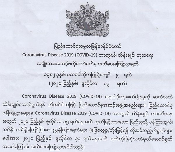 据缅甸新冠肺炎(Covid-19)疫情防控国家级中央委员会公告,原先定为7月15日止的防疫禁令延长至7月31日。