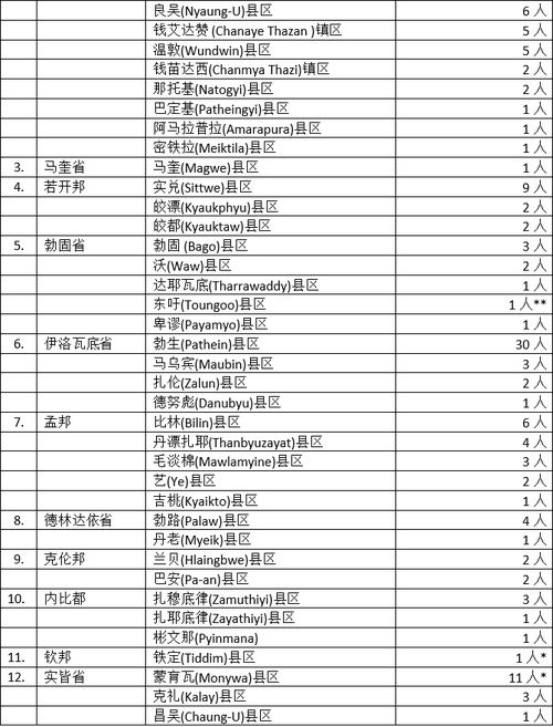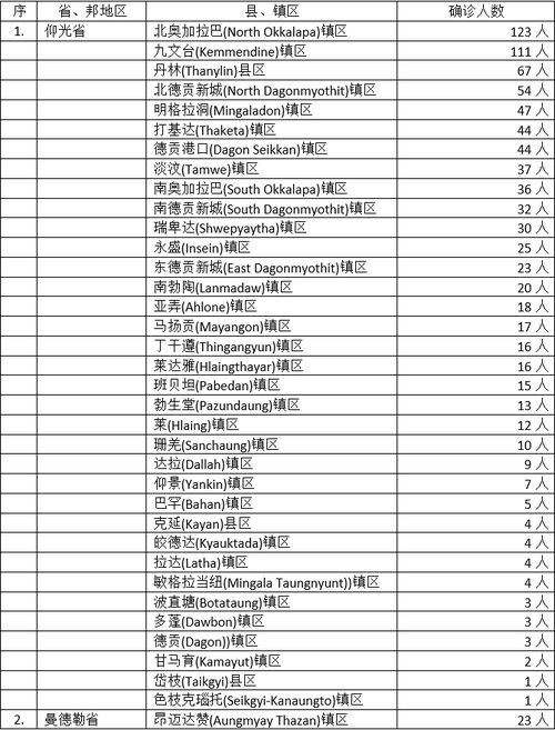 1010名确诊者中,仰光省35个县镇区感染860人,占总人数的85%,确诊人数还是全国之冠。确诊人数最多的为北奥加拉巴镇区123人及九文台镇区111人,人数都在百人以上。位居第3 的是丹林县区67人,作为周边农业县也有这么多人感染令人心中不安,不过考虑到该地区也属工业区之一,工人人数众多,应该也是有可能的(不似端低县区那样几乎是纯粹的农业县)。而接下来感染人数最多的是曼德勒省的9县46人,特别是属市中心地带的昂迈达赞镇区确诊人数就达到23人,为全省确诊人数的一半。本来曼德勒省方面已加强疫情管控工作,但仍有这么多人再受感染,看来禁足令还应再扩大范围(前所公布的禁足令县镇不包括这昂迈达赞镇区)。而伊洛瓦底省4县36人,首府勃生市就占了30人的名额,显示这大城市的疫情蔓延情况不能小视。与这两省情况相比,第二波疫情始发地若开邦的3县13名确诊者的“成绩”,已是算不了什么;有人以此为据,认为若开邦疫情已稳定了,但还得看以后几天的后续情况。比较严重的还有实皆省3县15名确诊者的情况,亲敦江畔重镇蒙育瓦一举发现11名确诊者,引人震惊(之前该市几乎没有任何确诊者),人们认为这可能是由缅印边境地区传入(因蒙育瓦市是印缅边贸货物交流地之一),不管怎样,其疫情蔓延情况不能掉以轻心。孟邦5县16名确诊者,比林、毛淡棉等县区的疫情显然还在蔓延之中。其他省邦地区中,勃固省5县8名确诊者,内比都3县5名确诊者,德林达依2县5名确诊者,克伦邦2县4名确诊者,看似人数不多,但都是不能忽视的地区。例如内比都的扎穆底律县区,感染人数累积到今天已经相当可观,人们都疑惑这县区为什么到今天还不颁布禁足令呢(因位于首都地区怕公务来往受影响?)。而德林达依省的勃路县区是第一次出现疫情确诊者,马上就发现有4人受感染,也不能不令人认为应谨慎处理之。最后钦邦及马奎省虽然都是1县1名确诊者,但有关县区是很早就发现疫情确诊者的地区,对之自然也是应“提高警惕”才是了。