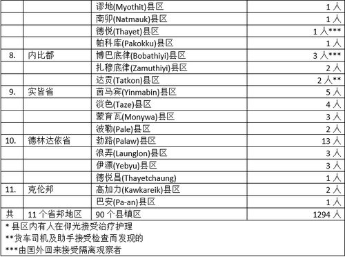 缅甸卫生暨体育部10月5日下午4时30分发出公告,通告10月4日这一天发现的1294名确诊者的一些情况。这1294名确诊者来自11个省邦地区,他们所属的县镇地区如下: