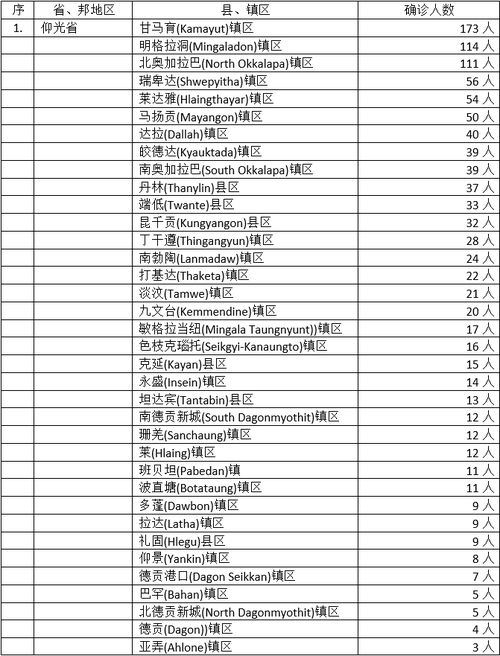 1252名确诊者中,仰光省42个县镇区感染1094人,占总人数的87%,确诊人数比例高而且照样压倒性地居于全缅之冠。其中确诊人数最多的是甘马育镇区(173人),是著名的仰光大学所在镇区,看来象牙之塔仍然阻挡不了疫情的蔓延与传播;位居第二的是明加拉洞镇区地区(确诊人数114人),这里有著名的国际机场及工业区,工厂众多人口稠密,现在估计该镇区确诊人数已达877人,直追永盛、丁甘遵等镇区。