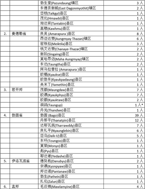 其他省邦地区,勃固省9县73名确诊者,其中勃固县确诊人数达到39人,与前几天相比,似乎又面临一次疫情蔓延高峰。而曼德勒省11县区29名确诊者,若开邦5县区18名确诊者,孟邦5县区10名确诊者,内比都6县区12名确诊者,平均人数似乎不算多,但这几个省邦地区是这一波疫情的“重灾区”,很难保证疫情会就此转向平缓。伊洛瓦底省5县区6名确诊者,马奎省4县6名确诊者,掸邦南部2县3名确诊者,克钦邦1县1名确诊者,似乎问题都不大,但伊洛瓦底省确诊人数是否会就此平缓,还不能确定,还得看今后几天的情况变化。