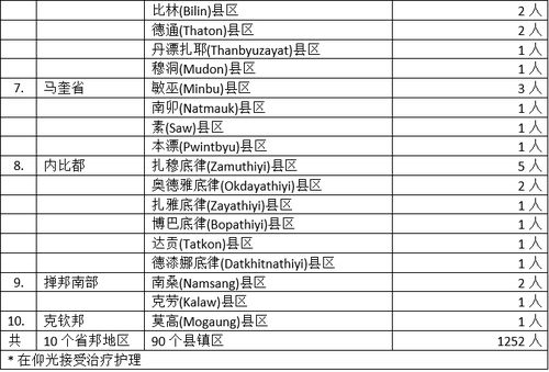 缅甸卫生暨体育部10月7日下午5时30分发出公告,通告10月6日这一天发现的1252名确诊者的一些情况。这1252名确诊者来自10个省邦地区,他们所属的县镇地区如下: