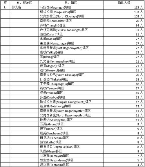 1123名确诊者中,仰光省41个县镇区感染915人,占总人数的81%,确诊人数比例照样是压倒性地居于全缅之冠。确诊人数最多的前3镇区为马扬贡镇区(115人),明加拉洞镇区(103人)及北奥加拉巴镇区(102人)。这3镇区确诊人数都在百人之上,显见疫情蔓延情况仍然不轻松。