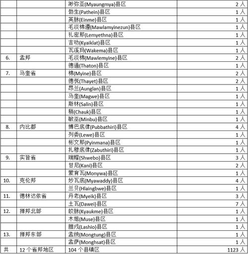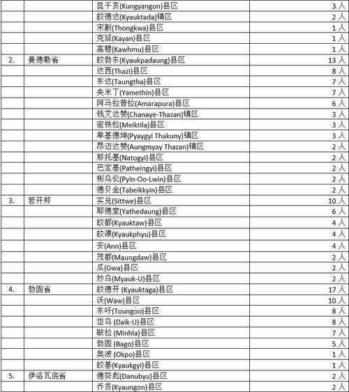 其余省邦地区中,勃固省8县57名确诊者,曼德勒省13县60名确诊者,若开邦8县34名确诊者,这3省邦都是这次第二波疫情的“重灾区”,现在只有若开邦情况有缓和迹象,但也还不能最后确定。而德林达依省2县10名确诊者,内比都地区4县7名确诊者,也显示这些地区疫情还在蔓延之中。至于马奎省7县9名确诊者,伊洛瓦底省9县12名确诊者,看来平均各县确诊者不多,但分布地区却广泛,不可不注意。剩下来的孟邦2县3名确诊者,实皆省3县6名确诊者,克伦邦2县5名确诊者,掸北3县3名确诊者,掸东2县2名确诊者虽然人数不多,但也得加以提防避免出现“星火燎原”的现象。特别是掸东的2县区,本来几乎就是“零确诊”地区,现在开始出现确诊者,需加以注意才行。