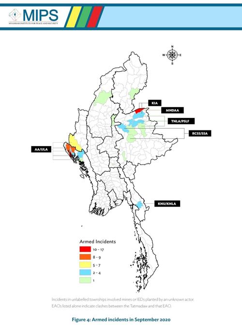 据缅甸和平与安全研究所基于各乡镇冲突检测机构的数据统计,缅甸在2020年9月共发生各类武装冲突81起,约为8月武装冲突事件的两倍。在9月的81起武装冲突中导致至少11名平民死亡,至少12人受伤。 从2020年1月至9月,缅甸在武装冲突中至少有276名平民死亡,至少584人受伤。