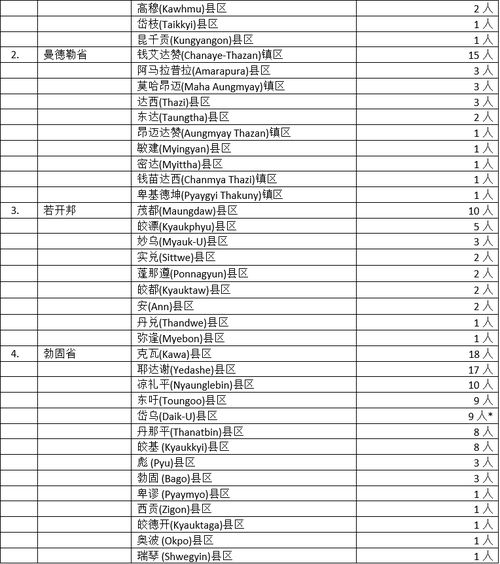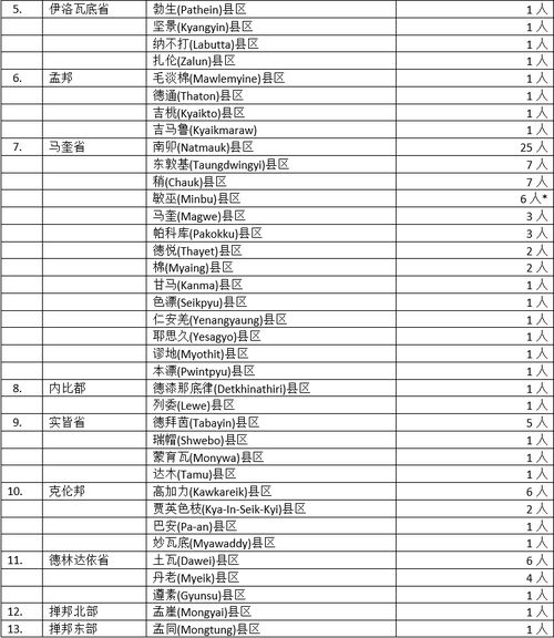 但其余省邦地区就不见得那么乐观了。勃固省14县90名确诊者,感染地区广泛,人数也是仅次于仰光,居全国第二位。而多个县区确诊人数都在10人左右甚至有接近20人的,情况不容乐观。而马奎省14县61名确诊者,同样引起人们的震惊,该省原来确诊人数并不多,但近期确诊人数却不断攀升,已隐隐发展成为“重灾区”之一了。而南卯县25名确诊者,已使这县区成为该省的确诊人数最多的县区了。而曼德勒省10县镇区31名确诊者,若开邦9县28名确诊者,这两个省邦地区的疫情显然还没有和缓的迹象,个别县镇区的确诊人数还是居高不下。另外德林达依省3县区11名确诊者,实皆省4县区8名确诊者,克伦邦4县区10名确诊者,钦邦3县7名确诊者,孟邦4县区7名确诊者,克钦邦3县5名确诊者,这几个省邦情况也还不稳定,个别县区有可能演变成疫情“重灾区”,不能不防。最后剩下的伊洛瓦底省4县4名确诊者,内比都2县区2名确诊者,掸邦北部、掸邦东部及克耶邦都是1县1名确诊者,这些好像都是“无足道哉”,但伊洛瓦底省及内比都原来就有多个县区感染严重,而克耶邦原本是缅甸唯一的“零确诊”的民族邦地区,现在也“沦陷”了,至此,缅甸的所有省邦地区,已没有任何省、邦是“零确诊”了,缅甸国内疫情的严重情况由此可见。