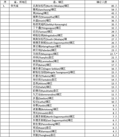 1025名确诊者中,仰光省39个县镇区感染758人,占总人数的74%,确诊人数比例照样是居于全缅之冠。但确诊人数最多的镇区人数降到了百人以下,应该说疫情蔓延情况是有所缓和了。