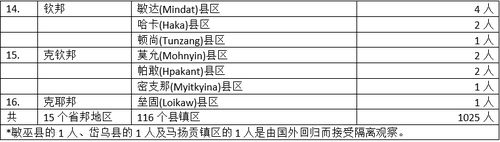 缅甸卫生暨体育部10月16日下午5时30分发出公告,通告10月15日这一天发现的1025名确诊者的一些情况。这1025名确诊者来自15个省邦地区,他们所属的县镇地区如下: