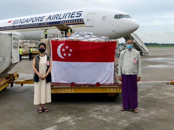 之前,国务资政杜昂山素季和新加坡外交部部长维维安·布拉·克里希南(Vivian Bla-Krishnan)博士进行了视频会谈,新加坡外长承诺向缅甸捐赠抗疫医疗用品,两周后首批抗疫医疗物资PCR Test 25000套,医用口罩12万个和洗手液3300桶抵达仰光机场。