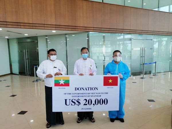 越南向缅甸捐赠价值20万美元的新冠肺炎医疗用品,其中包括医用口罩及手套。该物质于10月15日抵达仰光机场,越南驻缅甸大使和仰光医学研究院主任吴苏丹吞博士(Dr. U Zaw Than Tun)出席了在仰光机场举行的移交仪式。