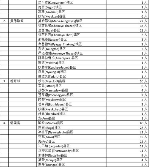 其余省邦地区的情况也不乐观。勃固省13县156名确诊者,在各省邦地区中还是名列前茅,而且敏拉县区确诊人数到达40名,成为该省的疫情“重灾区”了,而省内还有多个县区疫情确诊人数高居不下,显见疫情情况还不能缓和。而其余省邦中,曼德勒省13县76名确诊者,孟邦4县39名确诊者,内比都1县区却有30名确诊者,都说明了这些省区疫情蔓延情况的严重性。特别是孟邦18日时只有1名确诊者,内比都还是“零确诊”,现在19日马上就变天,孟邦首府毛淡棉1县就有32名确诊者,内比都彬文那1县就有30名确诊者,都说明疫情的反复性、持久性超出一些人的想象。克钦邦2县区25名确诊者中,帕敢1县就独占24人,也说明该宝石之乡疫情的严重性。而伊洛瓦底省8县区13名确诊者,实皆省6县14名确诊者,若开邦9县29名确诊者,确诊人数有所减少,但却不敢说疫情缓和,“因为谁都不能保证第二天早晨确诊人数不会突然暴增。”一位医务人员如是说道。剩下的马奎省4县5名确诊者,德林达依省2县3名确诊者,克伦邦3县6名确诊者,钦邦及掸邦均为1县1名确诊者,这些省邦确诊者人数不多,但也不能掉以轻心,因为直到今天,还没有人能对疫情的蔓延情况整理出一个头绪来。