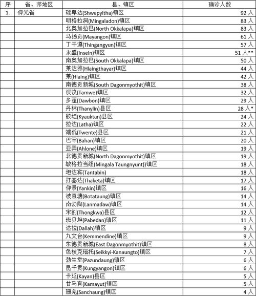 1306名确诊者中,仰光省41个县镇区感染1008人,占总人数的77%,确诊人数比例照样是居于全缅之冠,而确诊人数的县区总数到达41个县区。省内疫情蔓延情况还没有缓和迹象。