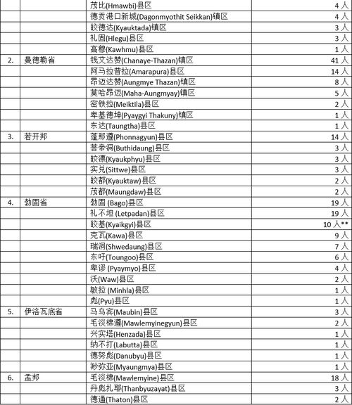 全国省邦地区的情况还是严峻。勃固省10县78名确诊者,确诊人数与19日相比是跌了一半,但在各省邦地区中还是名列前茅。其余省邦中,曼德勒省7县区72名确诊者,其中钱艾达赞居然有41名确诊者,疫情蔓延情况不可谓不严重。马奎省11县61名确诊者,也显现出该省的疫情情况日益严重了。若开邦6县区27名确诊者,孟邦4县区24名确诊者,这两邦的确诊人数有所减少,但不敢保证这是疫情和缓的现象。剩下的省邦中,伊洛瓦底省6县区9名确诊者,实皆省5县区9名确诊者,克伦邦3县区5名确诊者,德林达依省2县区6名确诊者,内比都1县区3名确诊者,掸邦与克钦邦都是2县区2名确诊者,确诊人数不算多,但还是不能放松警惕性,因为谁也不敢保证死灰复燃的现象不会重现。