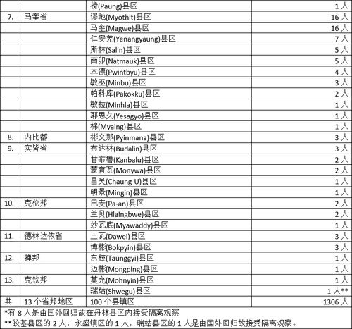 缅甸卫生暨体育部10月21日下午4时30分发出公告,通告10月20日这一天发现的1306名确诊者的一些情况。这1306名确诊者来自13个省邦地区,他们所属的县镇地区如下: