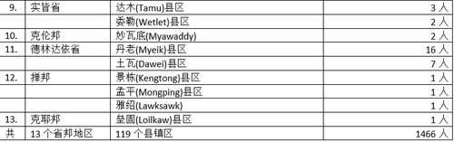 全国各省邦的蔓延情况,勃固省第一的地位为伊洛瓦底省10县区108名确诊者的记录所取代,而且马乌宾单日确诊人数达到69人,显现出该地区疫情的严重性。勃固省与曼德勒省的感染县区都是14县,但勃固省确诊人数达到64人,曼德勒省为49人,两省的疫情蔓延情况仍旧不能乐观。而马奎省10县区56名确诊者,说明该省的疫情蔓延情况同样十分严重。相对比较起来,若开邦11县区35名确诊者,情况是比较和缓一些了,但这只是“相对”而论,其实若开邦的疫情不断出现反复,直到今天还未见有和缓的迹象。而德林达依省区2县23名确诊者,也透析出该省的疫情蔓延的严重性,特别是丹老(16名确诊者)及土瓦(7名确诊者)是该省的两大重镇,疫情感染情况不能掉以轻心。其余省邦地区,孟邦4县区17名确诊者,内比都6县11名确诊者,说明此2 地区疫情情况还不稳定,说不定有“死灰复燃”的可能性。剩下的省邦,实皆省2县5名确诊者,克伦邦1县2名确诊者,掸邦3县区3名确诊者,克耶邦1县1名确诊者,看似确诊人数不多,但也还是不能放松警惕性,原来“零确诊”的克耶邦现在已是第4名确诊病患了,有人担心会继续蔓延,说不定在一个早晨其的蔓延人数就会突然暴增到一个令人吃惊的数据呢。