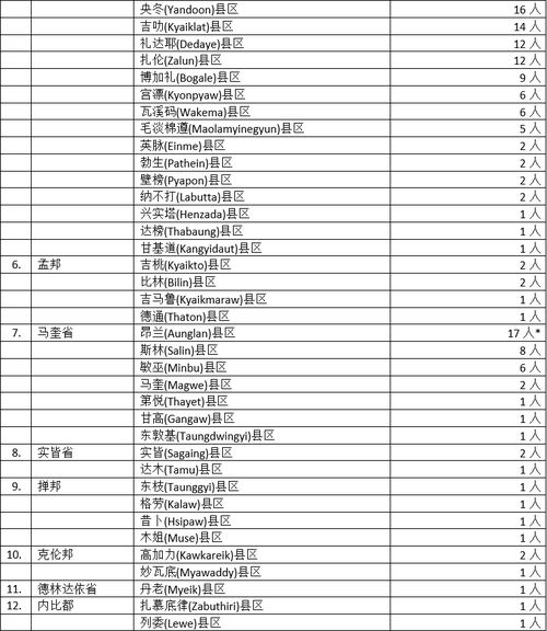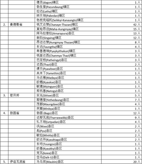 全国各省邦的蔓延情况,曼德勒省及伊洛瓦底省都是16县区111名确诊者,不论是县区总数还是确诊人数都联袂位居各省邦第一,曼德勒5个闹市区照旧榜上有名,且钱艾达赞镇区42名确诊者位居全省第一,蔓延情况显然十分严峻。伊洛瓦底省也有5个县区确诊人数在10名以上,疫情显然还无缓和迹象。接下来勃固省省11县37名确诊者,马奎省7县区36名确诊者,其中勃固省的勃固县区(12名确诊者),马奎省昂兰县区(17名确诊者),疫情情况同样还是显得严重,不能掉以轻心。而若开邦、孟邦、掸邦这3个民族邦,都是4个县区受感染,但确诊人数却不同,若开邦17人,孟邦6人,掸邦4人,恰好代表各邦疫情程度高低不同。最后剩下的实皆省与克伦邦都是2县去3名确诊者,内比都2县区2名确诊者,德林达依1县区1名确诊者,情况似乎都不严重,疫情似乎和缓了,但也不敢保证不会“死灰复燃”,还是不能放松有关防疫工作。