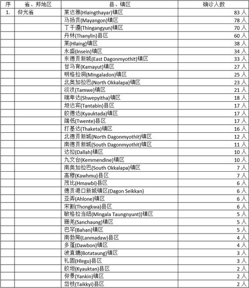 1029名确诊者中,仰光省确诊人数为698人,占总人数的68%,确诊人数比例有所下降但照样是居于全缅之冠,确诊人数的县镇区总数到达41个县区,确诊人数最多的县镇区为莱达雅镇区(确诊人数83人),其次为马扬贡镇区(78人),这2个镇区都是疫情蔓延的“重灾区”,确诊人数一直高居不下,情况严重不容忽视。