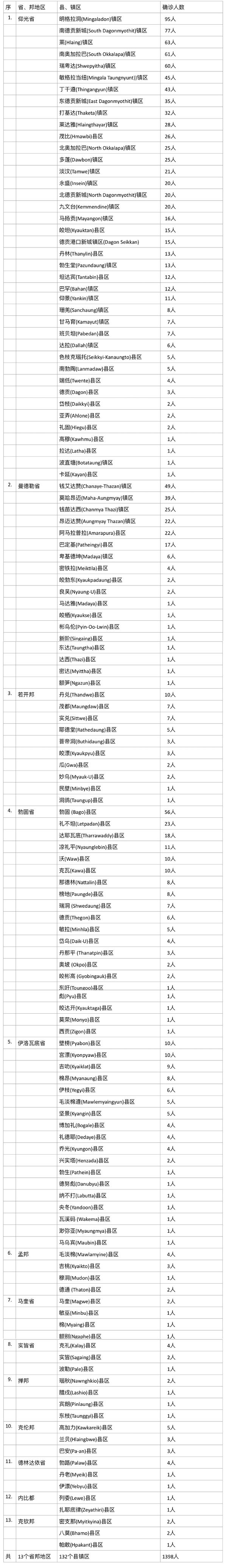 1398名确诊者中,仰光省确诊人数为858人,占总人数的61%,确诊人数在比例方面及总数方面都有所下降。确诊的县镇区总数到达40个县镇区,确诊人数最多的县镇区为明加拉洞镇区(95人),其次是南德贡新城镇区(确诊人数77人)。