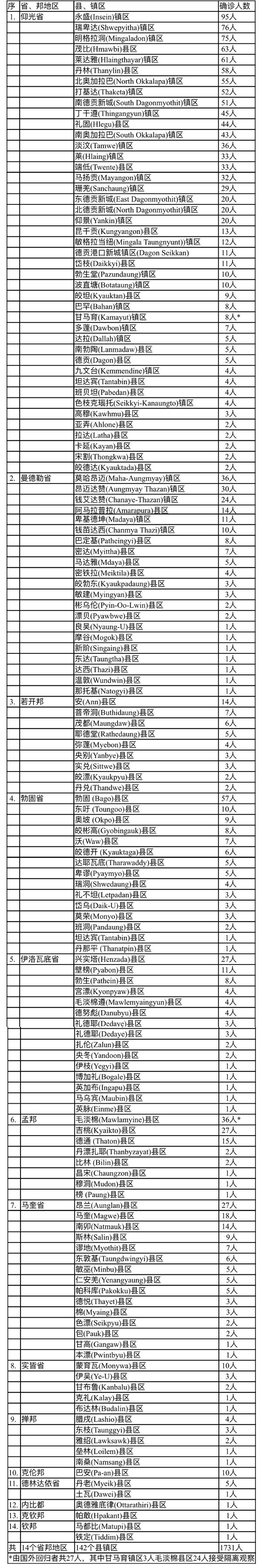 1731名确诊者中,仰光省确诊人数为1084人,占总人数的63%,确诊人数在比例方面有所下降,但总人数再次攀升到千人以上,确诊的县镇区总数也到达43个县镇区,除了孤悬在海外的可可岛外,仰光省各县镇区都榜上有名了,确诊人数最多的县镇区为永盛镇区(95人),其次是瑞卑达镇区(76人)及明加拉洞镇区(75人)。