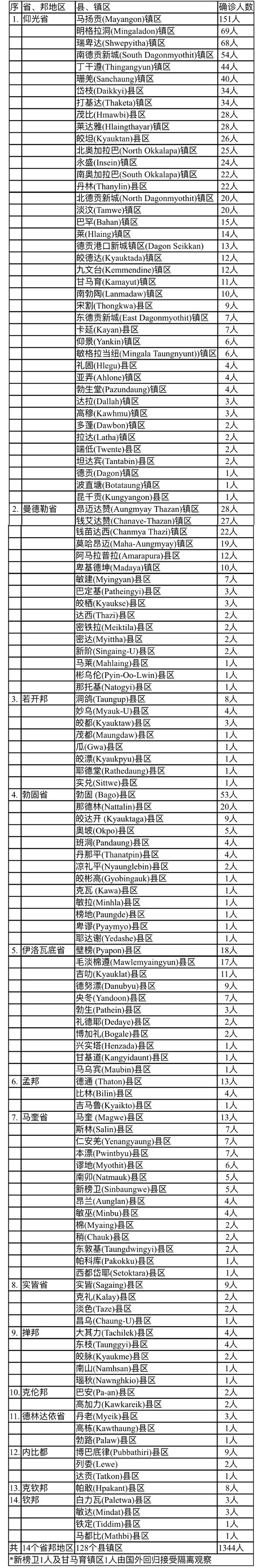 缅甸卫生暨体育部11月29日下午4时发出公告,通告11月28日这一天发现的1344名确诊者的一些情况。这1344名确诊者来自14个省邦地区,他们所属的县镇地区如下: