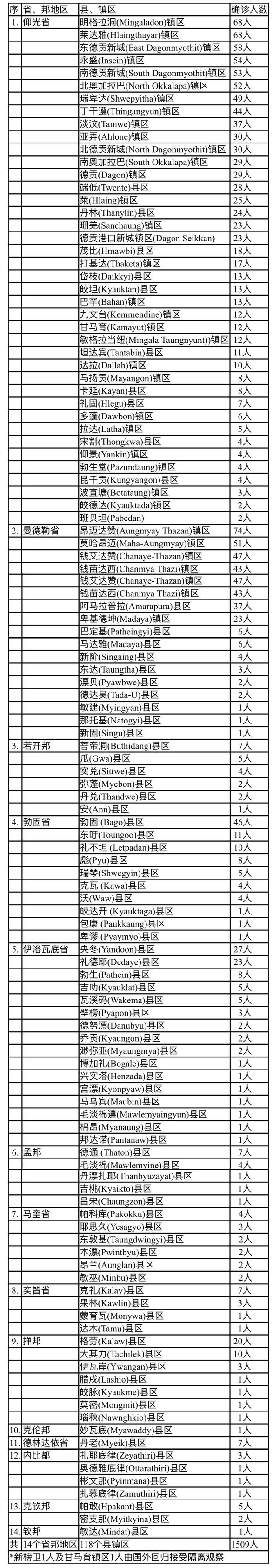 1509名确诊者中,仰光省确诊人数为912人,占总人数的60%,确诊人数比例有所下降但仍是位居全国第一位。确诊的县镇区总数到达40个县镇区,确诊人数最多的县镇区为明加拉洞镇区及莱达雅镇区(皆为68人)。
